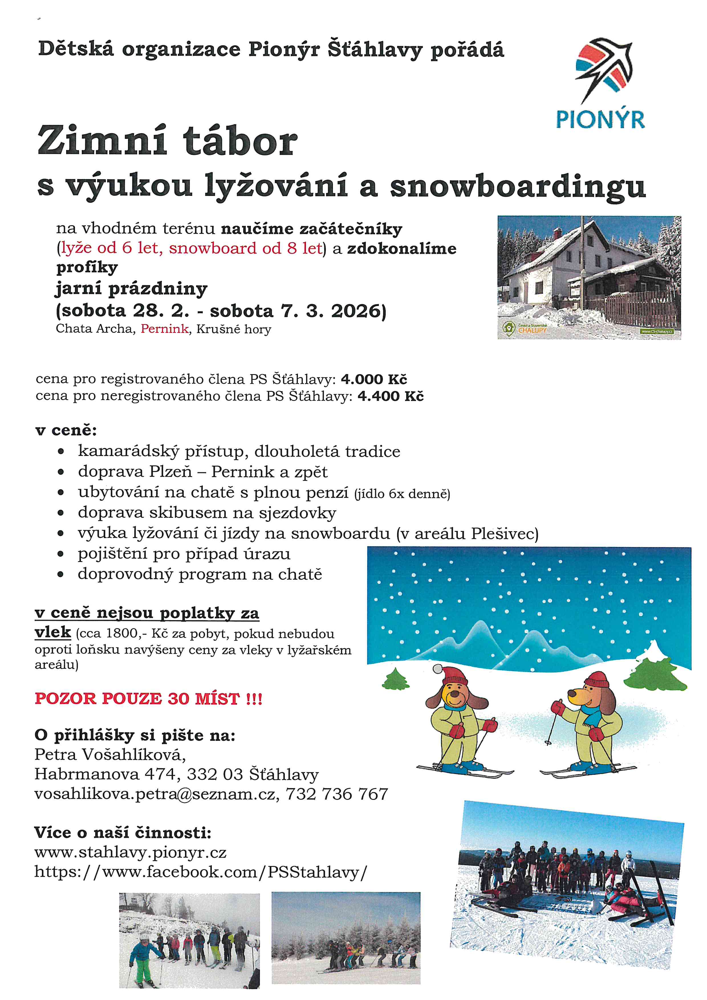 28. 2. - 7. 3. 2026 Pořadatel: Pionýrská skupina Šťáhlavy Místo konání: chata Archa, KarlovarskýTýdenní tábor o jarních prázdninách zaměřený na výuku lyžování a jízdy na snowboardu, doplněný o program na chatě. Ubytování ve vícelůžkových pokojích, strava zajištěna 5x denně přímo na chatě, odv...
