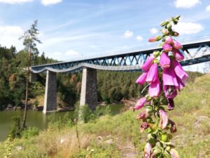 • Líbí se mi kontrast přírody se stavbou v pozadí. Most tvoří linii mezi květinou a stromem, kdy strom i květina mají stejné zakřivení, což je dobré v kombinaci s dynamikou oblouků mostu.